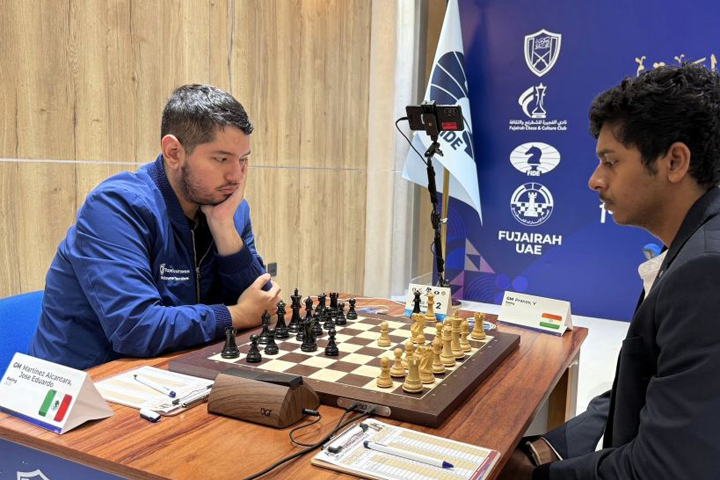 8/29/2025 – Round five of the Fujairah Global Chess Championship's Superstars tournament ended with Sanan Sjugirov and Pranav Venkatesh moving into joint first place on 4 points. Sjugirov defeated fellow Hungarian Gleb Dudin, while Pranav beat Mexico's José Martínez Alcántara in a sharp encounter (pictured). A five-player chasing pack trails just half a point behind, including Zhu Jiner, who drew with Aydin Suleymanli to continue her consistent run. | Photo: Aditya Sur Roy