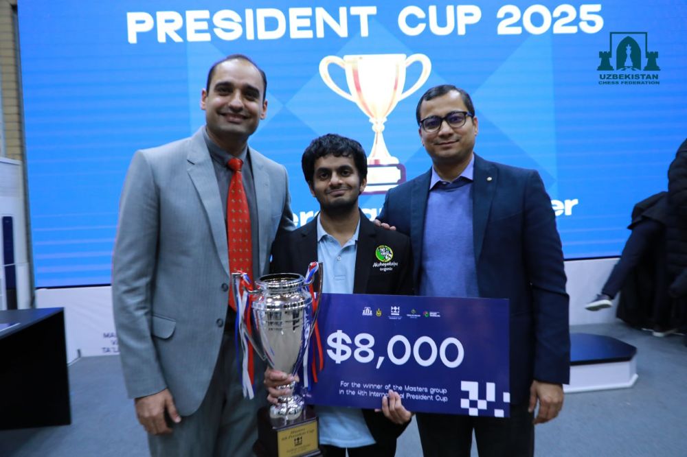 12/13/2025 – Nihal Sarin claimed a convincing victory at the Masters Tournament at the 4th President Cup in Tashkent, finishing on 7/9 and securing first place with a round to spare. A final-round win underlined his dominance, as he ended two points clear of the field. The tournament continued Nihal's strong run in Uzbekistan and brought a notable rating gain, as he concluded the event with a sensational 2836 TPR. | Photo: Uzbek Chess Federation