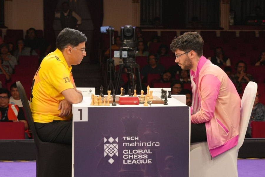 12/17/2025 – Momentum changed suddenly on the third day of the Global Chess League in Mumbai, as the early leaders were brought back into a tightly packed field. All three matches produced decisive results, reshaping the standings and leaving four teams level at the top. The day featured a notable top-board victory by Vishy Anand over Gukesh Dommaraju in the battle of Indian world champions, while Alireza Firouzja maintained his perfect start, extending his run to three wins from three games. | Photo: Aditya Sur Roy
