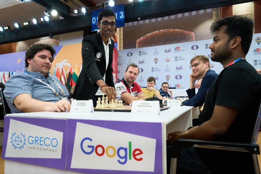 11/16/2025 – The group stage of the FIDE World Corporate Chess Championship 2025 concluded on Saturday, with Morgan Stanley, Deloitte 1, Greco and Google advancing to the semifinals. A visit from super-GM Praggnanandhaa Rameshbabu added a special moment to the day, which featured the return legs of the double round-robin format. With standings settled in both pools, teams now prepare for Sunday's decisive matches that will determine this year's corporate world champions. | Photos: Eteri Kublashvili / FIDE
