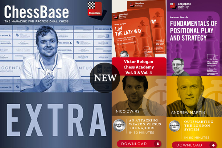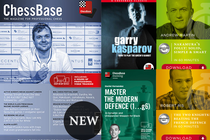 10/19/2025 – ChessBase's September releases provide you with everything you need to improve your game: Nico Zwirs and Andrew Martin's 60-minute courses will quickly equip you for a successful opening phase. Victor Bologan's "The Lazy Way" bundle immerses you in the depths of opening strategy and provides you with universal knowledge that you can perfect with Lubomir Ftacnik's course on positional play. In addition, the new ChessBase Magazine Extra offers training material for all phases of the game. Just take a look at all of last month's products.