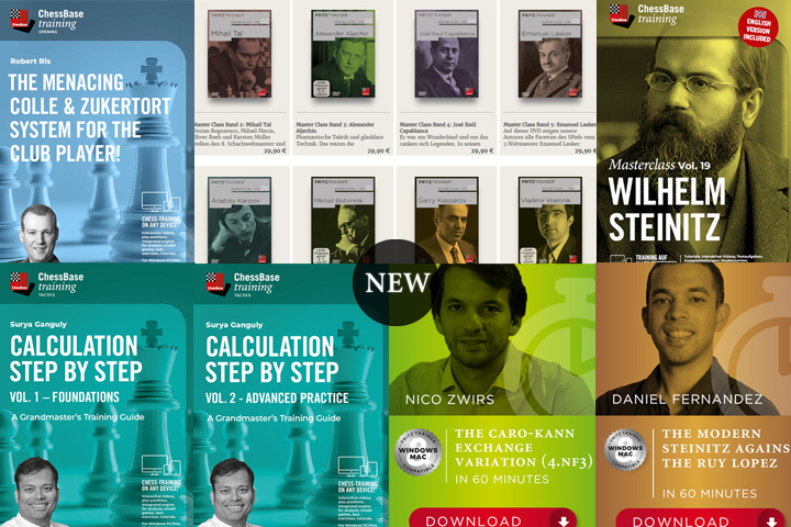 11/23/2025 – ChessBase’s October releases cover everything from chess history to opening repertoire and calculation training. In episode 19 of the Master Class series, the expert team of Dorian Rogozenco, Karsten Müller, Mihail Marin and Oliver Reeh presents the first World Champion, Wilhelm Steinitz. Robert Ris’ new opening course also reaches back to that era, as the opening he examines in depth is named after two classical masters: the Colle & Zukertort System. And who doesn’t enjoy looking into the thought processes of grandmasters and world-class trainers? Discover calculation techniques at the highest level — Surya Ganguly’s “Calculation Step by Step” is sure to climb the ChessBase bestseller list quickly. | All photos: ChessBase