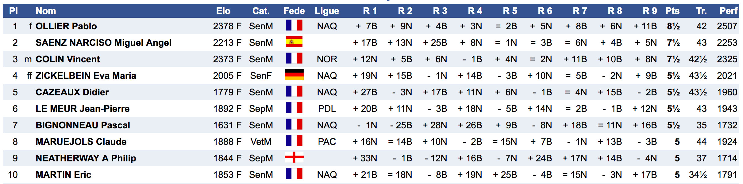 This year's edition was solidly won by FM Pablo Ollier (2378), who was also the top ranked at the outset. He yielded just one draw in the fifth round against the second place Miguel Saenz Narciso and won all the other games, for a fantastic score of 8.5 out of 9! His prize at weigh-in: 60 bottles of Médoc, which Pablo packed safely in his small car even with three passengers for the 500 kilometer drive to Clermont-Ferrand!