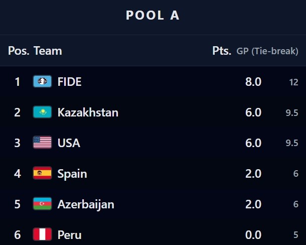 In Pool A, Team FIDE confidently extended its winning streak. Clear victories over Spain (3.5–0.5) and Azerbaijan (3–1) lifted the team to a perfect score. With this commanding lead, first place in the group is virtually secured — especially since their final-round opponent is Peru, a team that has lost all four of its matches so far.