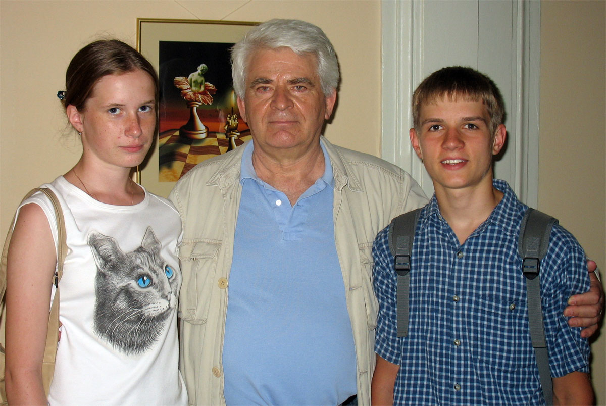 Picture of Boris Vasilyevich Spassky with future grandmasters Valentina Golubenko and Aleksandr Volodin, in June 2006, at the Mikhail Botvinnik Central Chess House. Valentina and Aleksandr are the best students of Anastasia Golubenko, Aleksandr is rating number 1 in Estonia now and president of club Diagonaal.