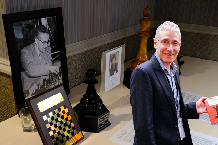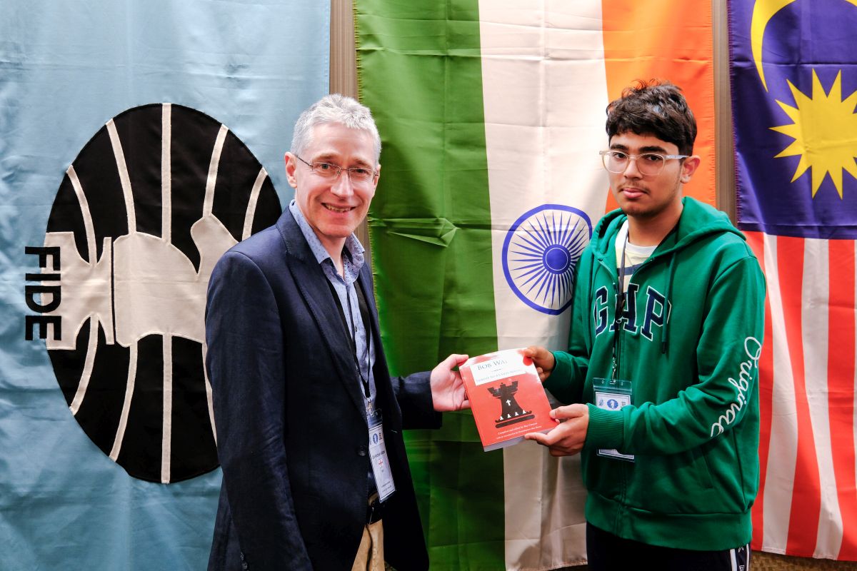 GM Adams receiving a copy of Bob Wade’s biography from local chess teen, Ayaan Bhatia