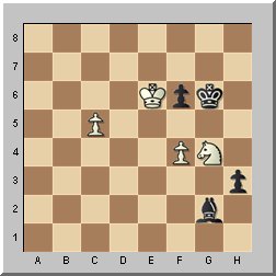 Now moving the bishop to f3, e4, c6, b7 or a8 would win comfortably. 53...Kh5? 54.Nf2?? (54.Nh2 draws) 54...h2 55.Kxf6 Kh4 56.Ke5 Kg3 0-1. [Click to replay]