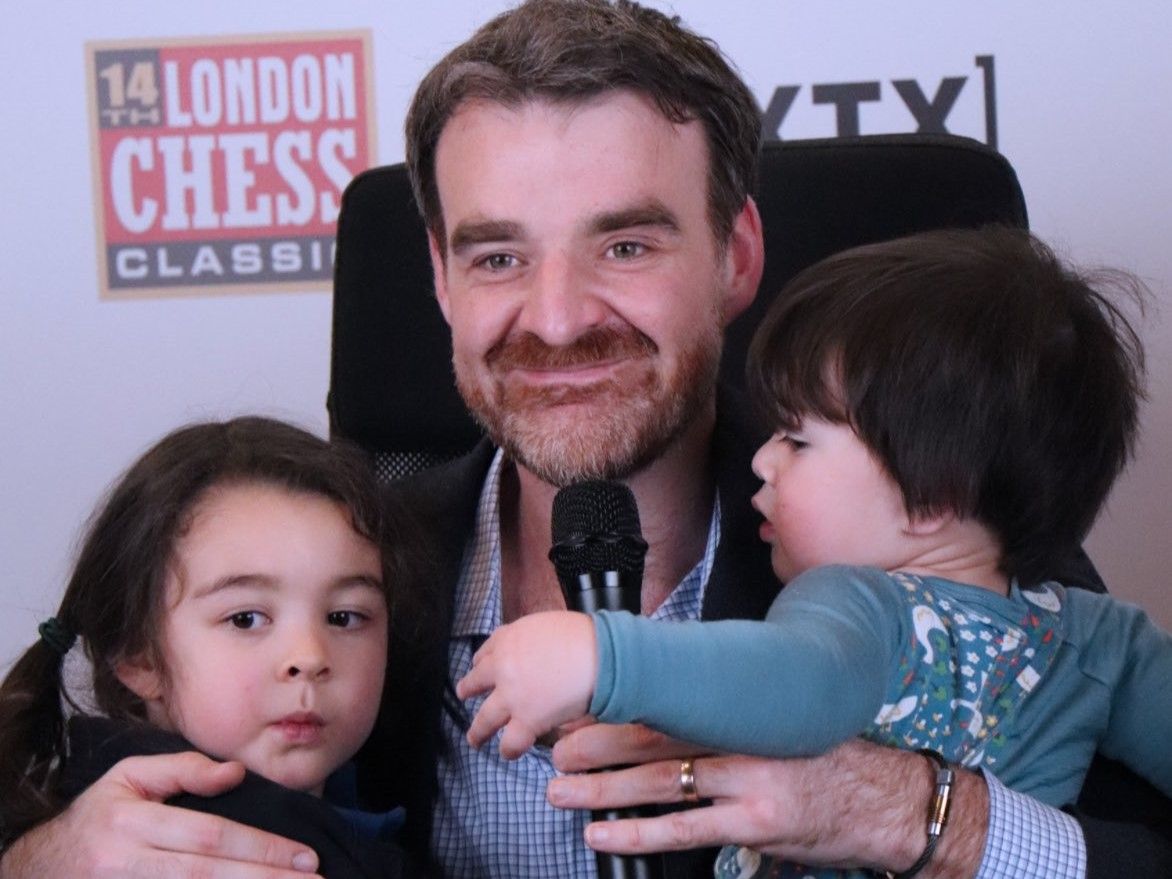 In 2024, grandmaster Gawain Jones, pictured celebrating with his two kids, was crowned champion for the first time. He returns this year to defend his title.