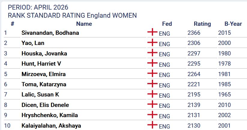 4/1/2026 – British chess phenom Bodhana Sivanandan has made history by shooting to the top of the UK chess rankings after a sensational start to 2026, the English Chess Federation is pleased to report. At ten, she was the youngest female chess player to beat a grandmaster, and the youngest ever to secure a WGM norm. She is really going places. We predict there will be a Netflix documentary about her in a few years' time.