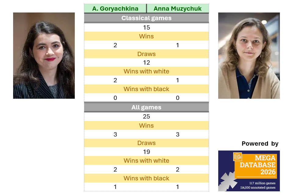 - Aleksandra Goryachkina and Anna Muzychuk have drawn most of their encounters, both in classical chess and in their games across all formats.