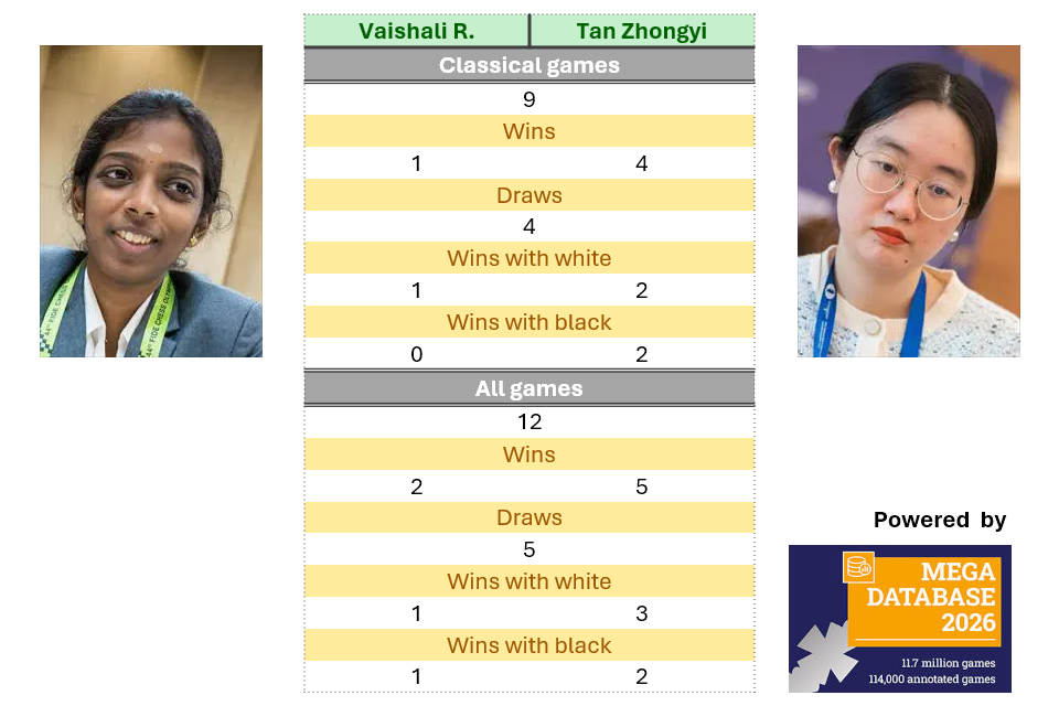 - Tan Zhongyi holds an advantage over Vaishali Rameshbabu both in their games across all formats and, specifically, in their classical chess confrontations. However, Vaishali defeated Tan in round seven of this event.