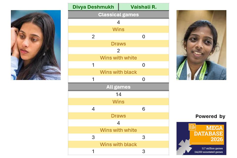 - Despite having a plus in games across all formats, Vaishali Rameshbabu has never defeated Divya Deshmukh in a classical game. Deshmukh twice beat her compatriot in classical games.