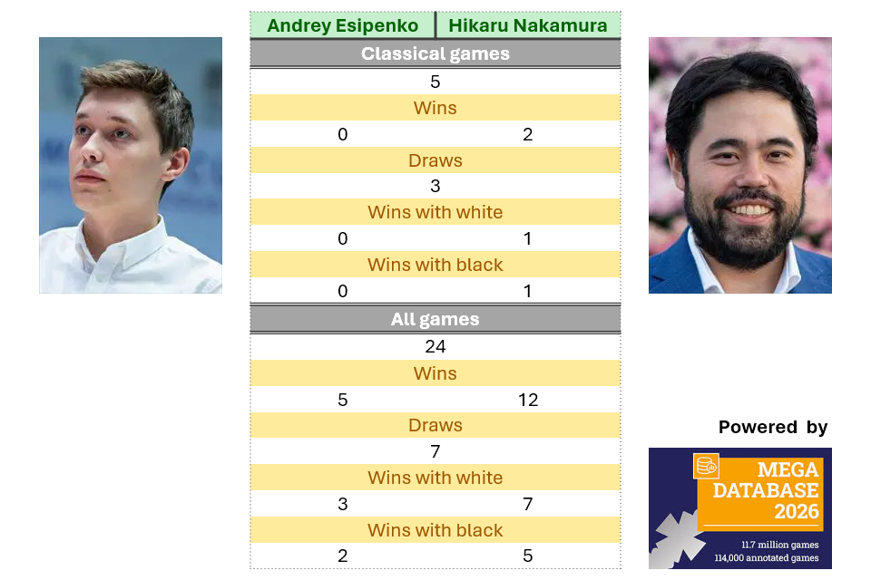 - Andrey Esipenko has never beat Hikaru Nakamura in a classical game, though they have only faced each other five times in this format.