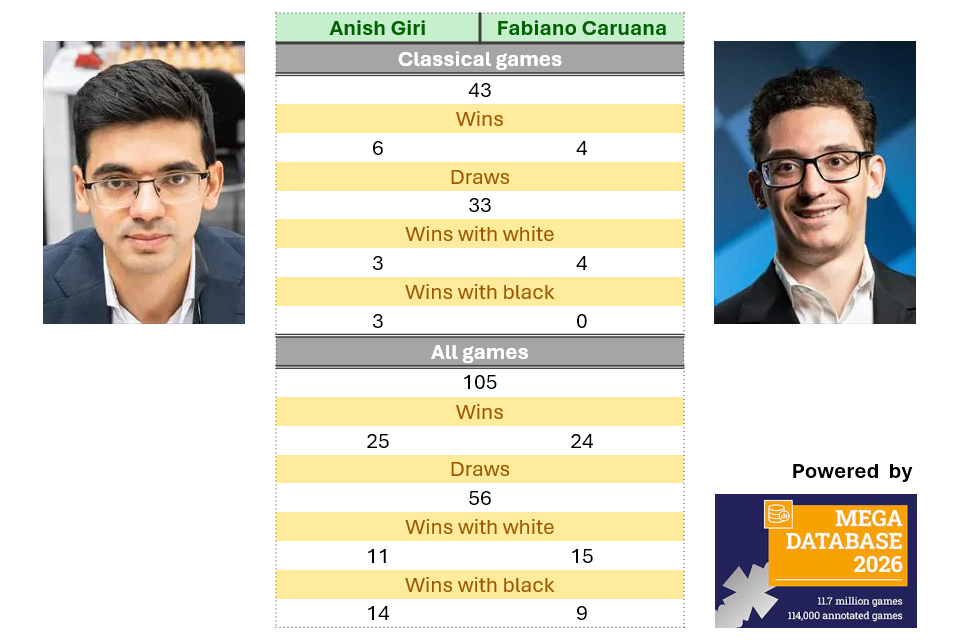- Anish Giri has a small edge over Fabiano Caruana both in classical games and in all their encounters (including rapid and blitz). Moreover, Caruana has never defeated Giri with black in a classical game.