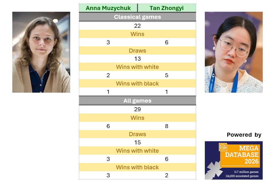 - Anna Muzychuk and Tan Zhongyi have a long record of classical encounters in important tournaments, starting with games at the under-10 and under-12 World Championships. Notably, Tan beat Muzychuk in the final match of the 2017 Women's World Championship knockout. They faced each other twice in the Women's FIDE World Cup as well -Muzychuk won their 2023 match.