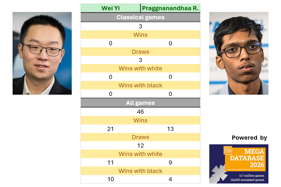 - Wei Yi has a clear edge over Praggnanandhaa Rameshbabu in their games across all formats. However, their three classical encounters have ended drawn.