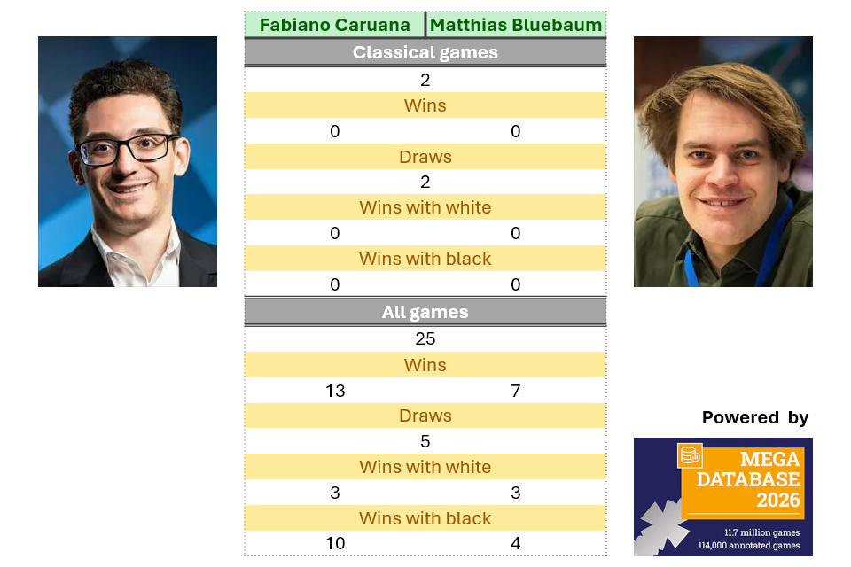 - Similarly, Fabiano Caruana and Matthias Bluebaum have only played two classical games, with most of their confrontations taking place online. In their online encounters, most games have finished decisively, with Caruana holding an advantage over the German grandmaster.