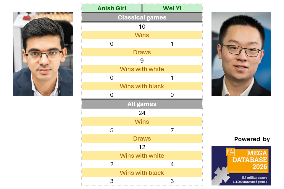 - Anish Giri and Wei Yi have faced each other in ten classical games, nine of which ended drawn. Wei scored the one win in their classical games, with the white pieces at the 2016 Bilbao Masters - the game featured a Berlin Defence.