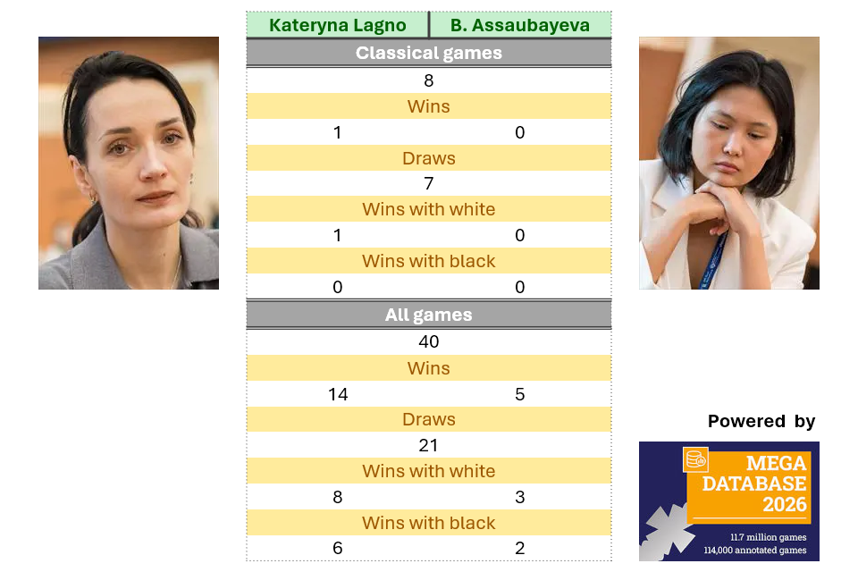 - Kateryna Lagno has a clear advantage over Bibisara Assaubayeva in their confrontations across all formats. In classical games, seven out of their eight encounters finished drawn. Lagno won the remaining game, with white at the 2024 Shymkent Grand Prix.