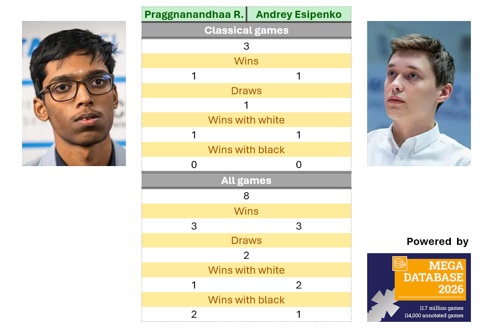 - Praggnanandhaa Rameshbabu and Andrey Esipenko have an even score both in their classical games and in their encounters across all formats.