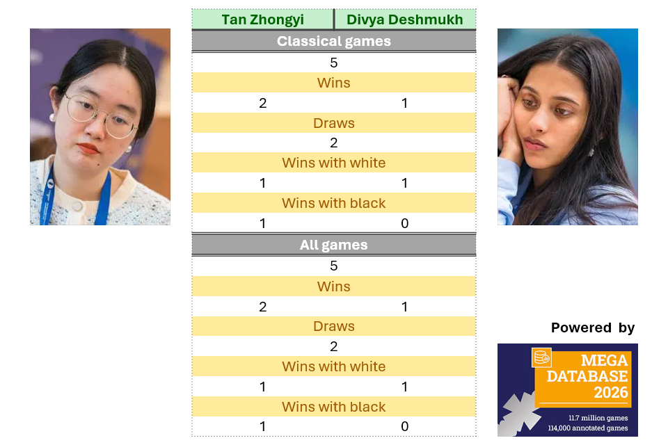 - All games recorded of Tan Zhongyi facing Divya Deshmukh were played in a classical format. Tan has a 2-1 advantage in the games that featured decisive results.