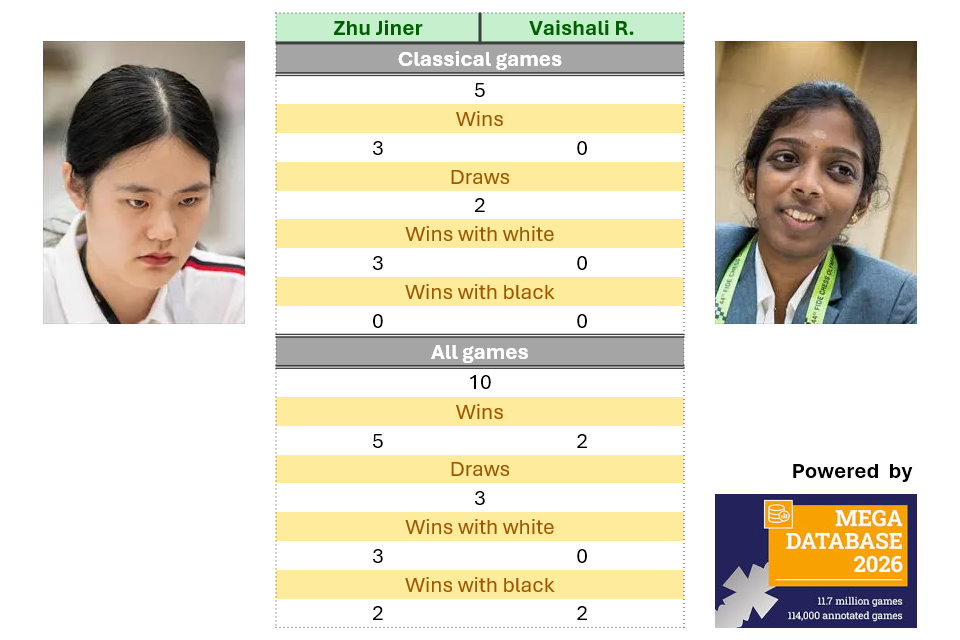 - Zhu Jiner has defeated Vaishali Rameshbabu in three out of their five classical games. The remaining two games ended drawn.