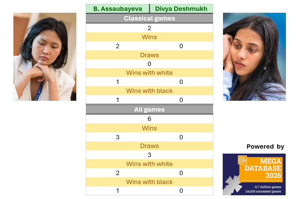 - There is no record of Divya Deshmukh ever obtaining a win over Bibisara Assaubayeva.