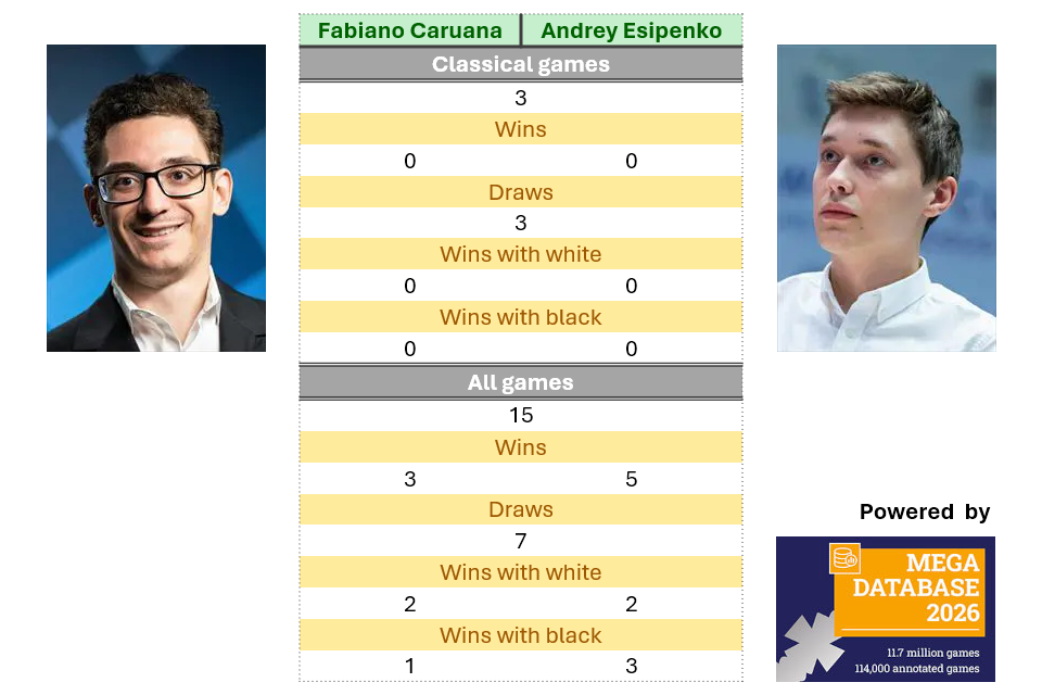 - Fabiano Caruana and Andrey Esipenko have yet to play a decisive game in classical chess. They signed draws in their three confrontations.