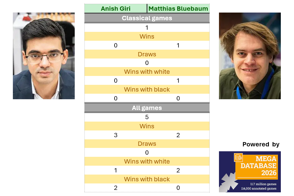 - Though Anish Giri leads the head-to-head scoreboard against Matthias Bluebaum across all formats, Bluebaum defeated the Dutch GM in their one decisive classical encounter, played at this year's Tata Steel Masters.