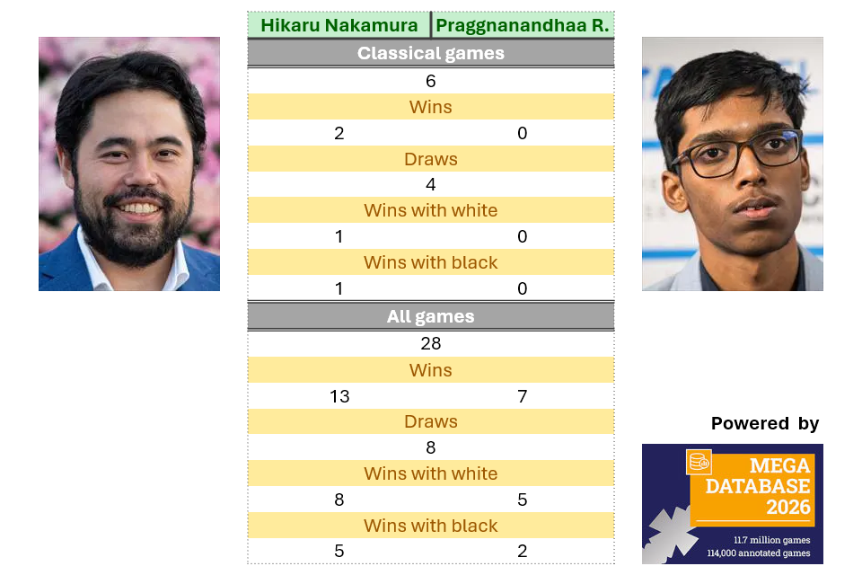 - Hikaru Nakamura and Praggnanandhaa Rameshbabu have mostly played in formats other than classical chess. Nakamura has an edge over his Indian colleague both in classical chess and across all formats.