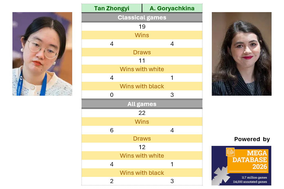 - Tan Zhongyi and Aleksandra Goryachkina have each won 4 of their 19 classical chess confrontations.