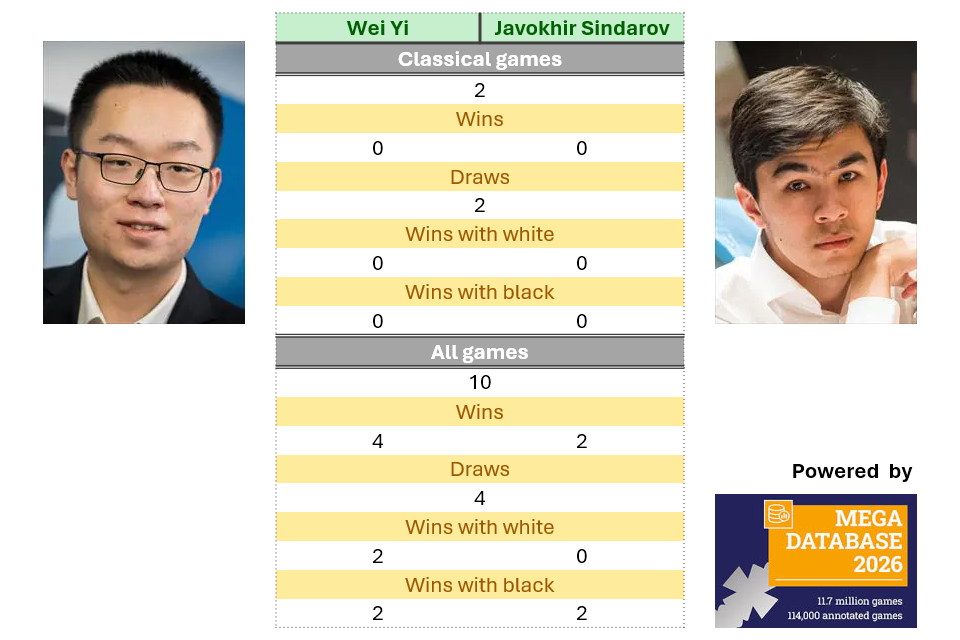 - Wei Yi and Javokhir Sindarov drew the two classical games they played against each other. Both of them were played in the final of the 2025 FIDE World Cup. Sindarov went on to win the event by defeating Wei in tiebreaks.