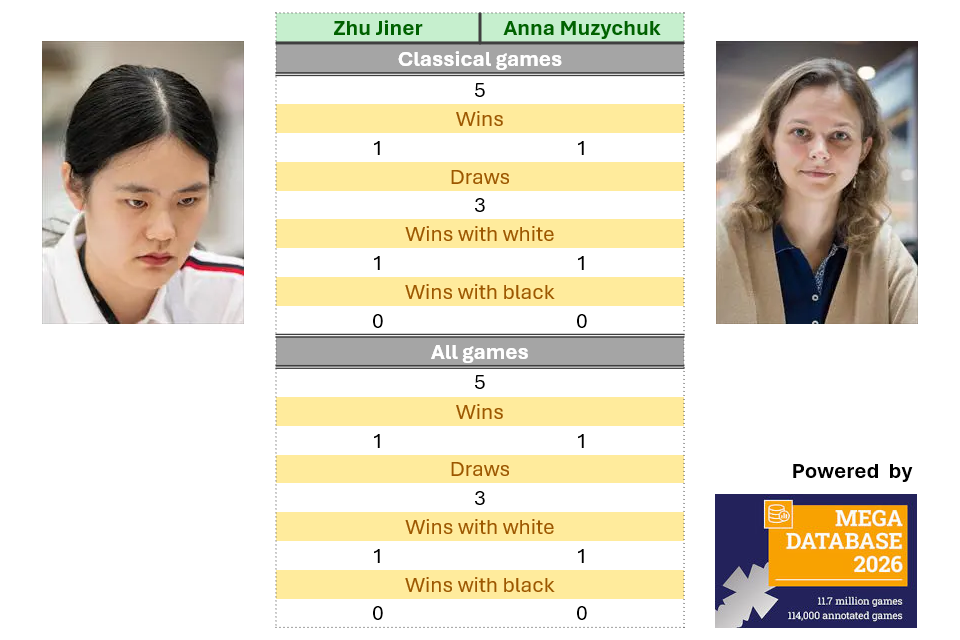 - All recorded games between Zhu Jiner and Anna Muzychuk were played in the classical format, with one win per side.