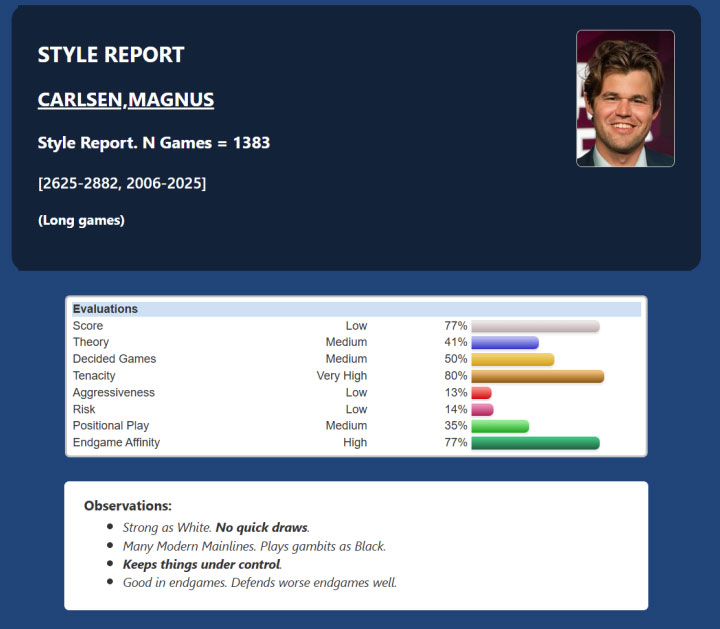 First introduced in ChessBase18, the Style Report remains one of my favorite features. With near-instant analysis of a player’s games, it generates a detailed profile of their style, preferences, strengths, and weaknesses. Instead of manually combing through hundreds of games to spot patterns, ChessBase does the heavy lifting for you.
