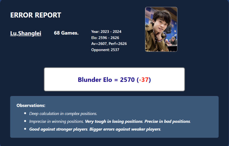 Closely related to the Style Report, the Error Report focuses on mistakes and accuracy rather than overall style. It highlights when and where a player tends to falter, comparing their performance to the level of an average grandmaster.