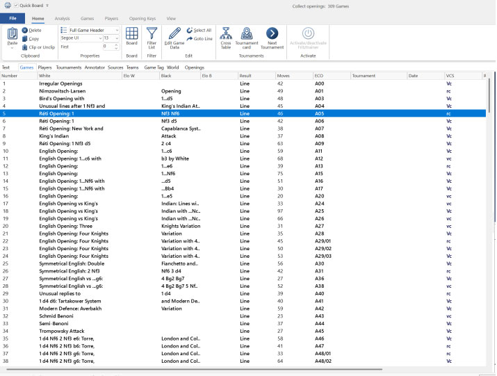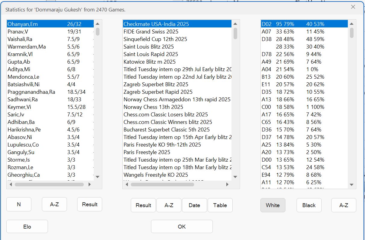 Within the player section, the Player Statistics option offers a quick snapshot of performance across all ECO codes—from A00 to E99. It also displays scores against individual opponents, neatly sorted by percentage. This feature is invaluable when you want to spot weaknesses at a glance, without wading through endless games. In seconds, you can identify which openings or opponents give a player trouble, and adjust your preparation accordingly.