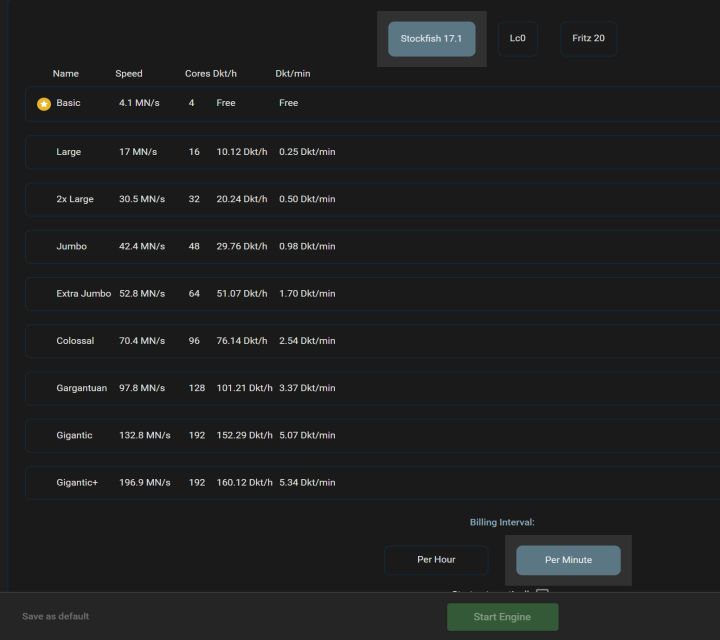 You can choose from different speeds and core configurations. A 4 MN/s engine is available for free—roughly equivalent to the performance of a standard laptop. From there, speeds scale all the way up to 192 MN/s, purchasable with Ducats (ChessBase’s official currency). This flexibility lets you tailor the service to your needs, whether you’re running quick checks or diving into marathon analysis sessions.