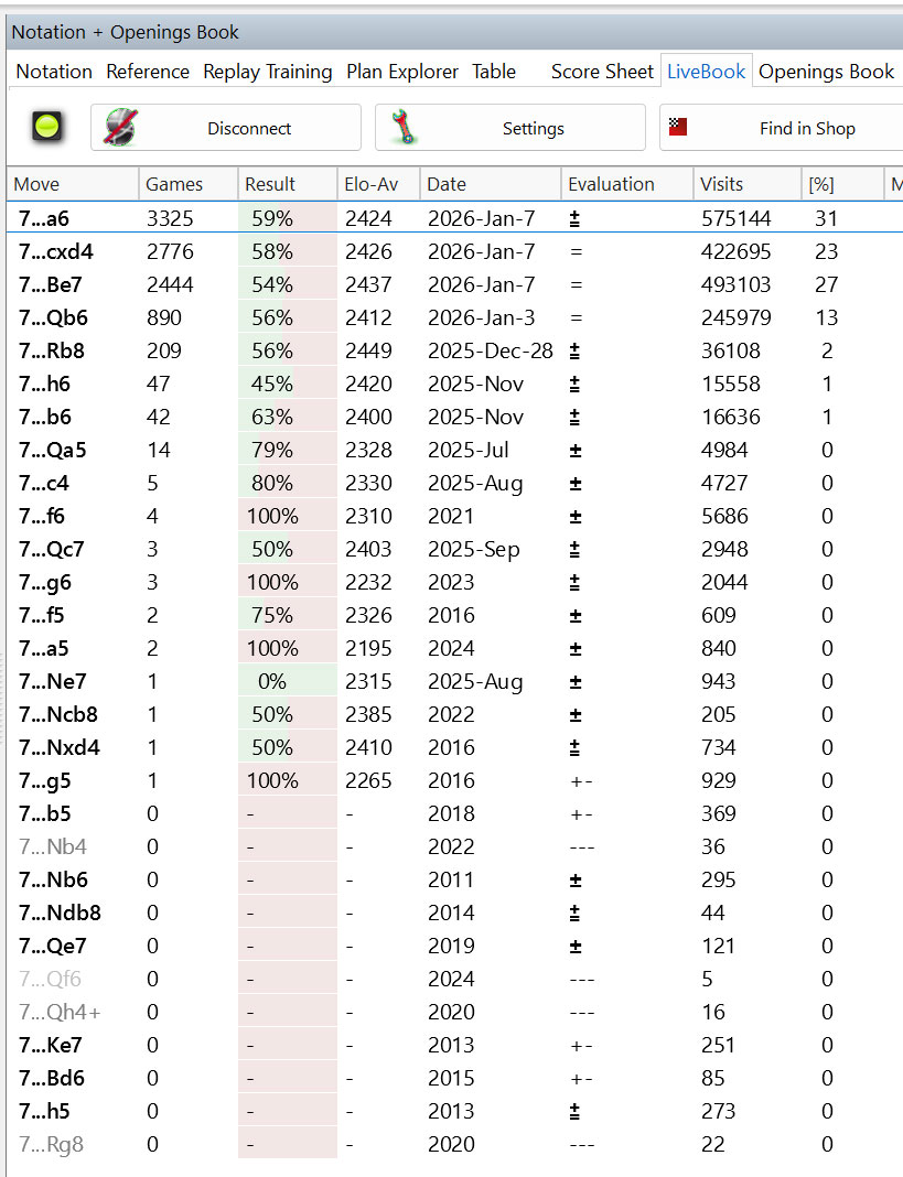 The Live Book is a dynamic twist on the Reference feature. Instead of ranking moves by the number of games played, it ranks them by the number of visits from ChessBase users. This often points toward cutting-edge theory, where traditional databases may lag behind due to rapid updates in engine analysis.
