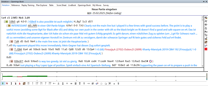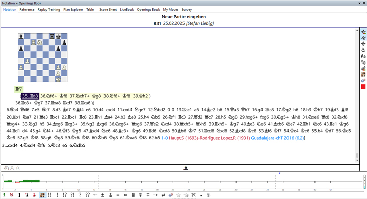 For illustrative purposes, we choose an example at the end of the notation, because there is less text there that could confuse the explanation. After 35.fxg3 a diagram was inserted. The main line 35...Rf7 follows, then the line 35...Rd8 etc. and the end of the main line. We first see the situation when 35...Rd8 is marked: