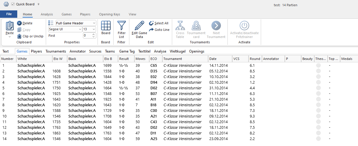 You can see that games 1 to 14 have all been added in annotated form at positions 15 to 28. In the "VCS" column, you can see that these new games are now marked as annotated in the database, and the "Medals" column also contains entries—more on that below.