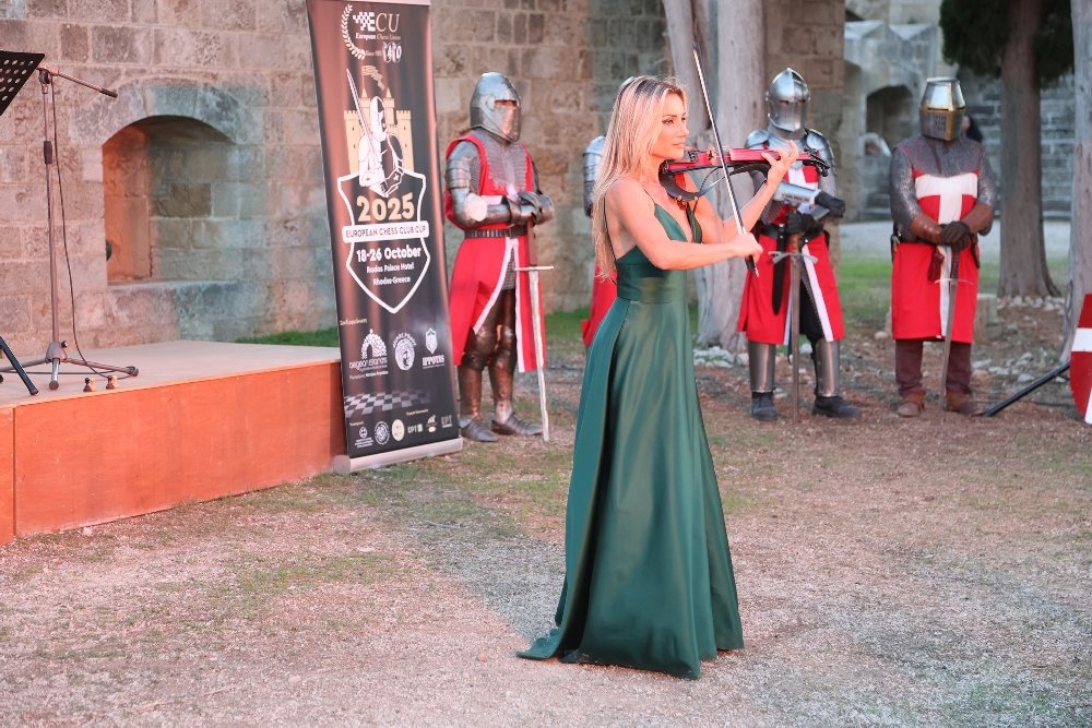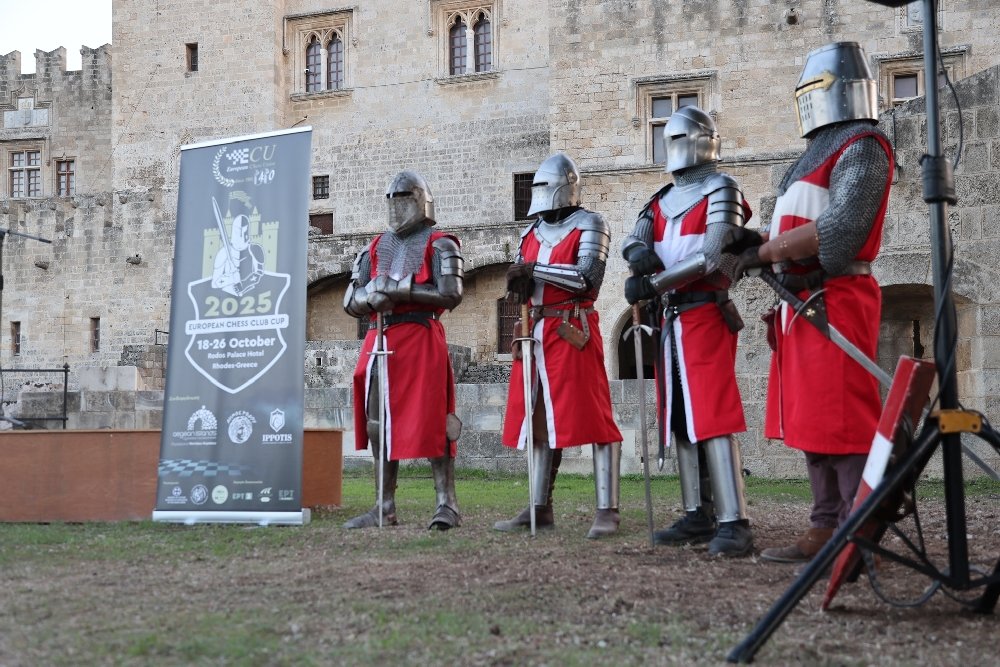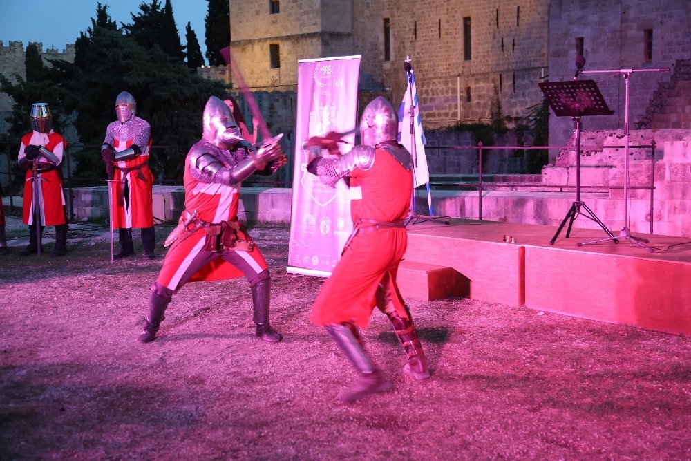 In addition, the Deputy Mayor of Rhodes gave a warm welcome speech. Assisted by two helmeted knights, the chief arbiter drew lots to determine the colour distribution for the Open and for the Women's Tournament. After the approximately one-hour opening ceremony, there was a ten-minute demonstration of knights fighting with swords. It was hoped that similarly exciting battles would later take place on the chessboards.