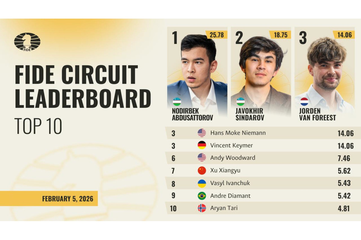 2/10/2026 – Nodirbek Abdusattorov heads the FIDE Circuit 2026–27 standings after winning the Tata Steel Masters, earning 25.78 points at one of the season’s most significant events. Javokhir Sindarov, Hans Niemann, Jorden van Foreest and Vincent Keymer follow closely behind, while other early results from Wijk aan Zee, the Rilton Cup and the Brazil Series have also shaped the leaderboard. A dedicated page tracks the latest standings and regulations for the new cycle. | Image: FIDE