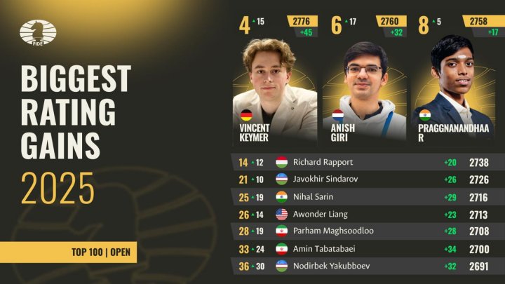 Several players began 2025 outside the top 100 Open but earned their way into this elite group through strong results. In absolute terms, their rating gains appear even more impressive, but the “low base effect” must be taken into account: the lower a player’s starting rating, the easier it is to achieve large point gains.