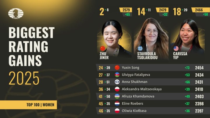 Xeniya Balabayeva broke into the top 100 after a strong showing at the Grenke Open (+39), then followed up with standout performances at the Asian Women’s Championship (+41) and the Oskemen Open Masters (+39), climbing to 70th place with an exceptional gain of 121 rating points.