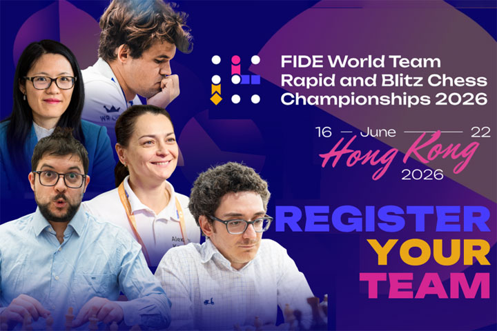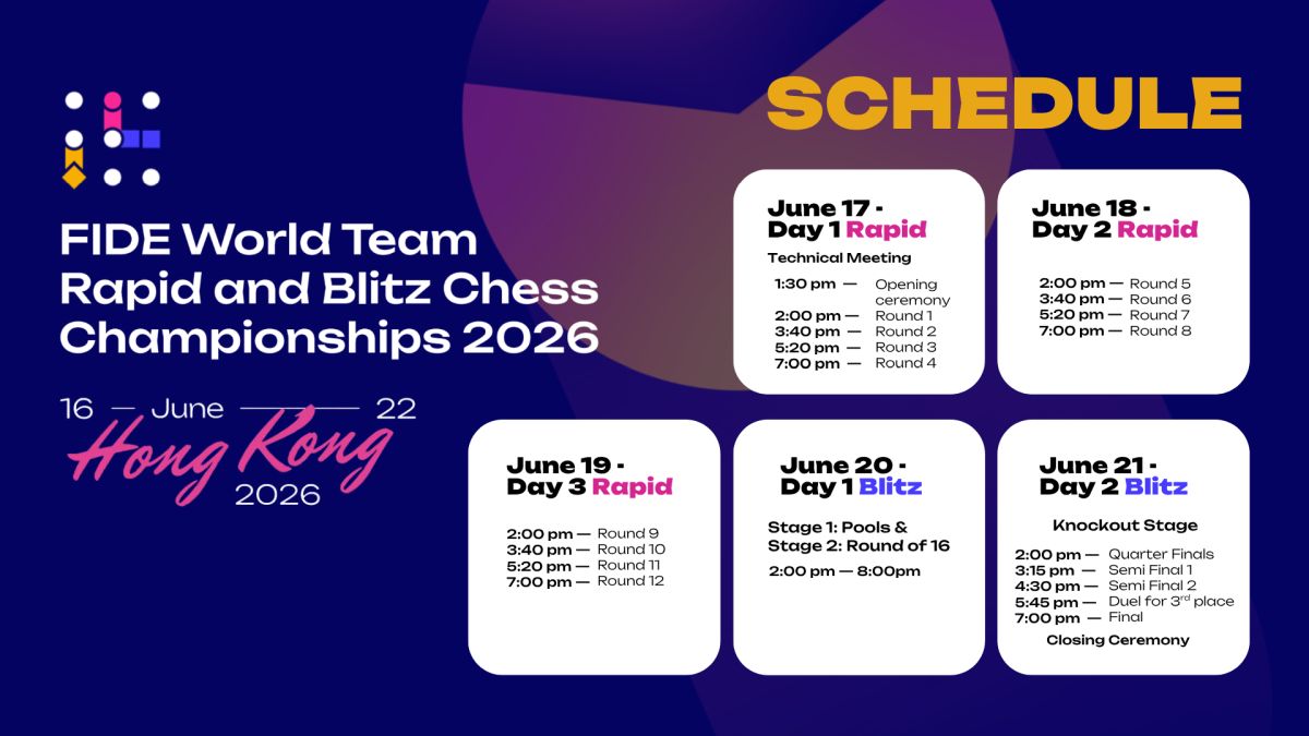 The FIDE World Team Rapid Chess Championship will be played as a 12-round Swiss tournament across three days (June 17-19), with four rounds per day and a time control of 15 minutes for the whole game plus a 10-second increment per move. The FIDE World Team Blitz Chess Championship follows on June 20 and 21, beginning with pool stages before moving to a knockout format for the top 16 teams, with a time control of 3 minutes plus a 2-second increment per move.