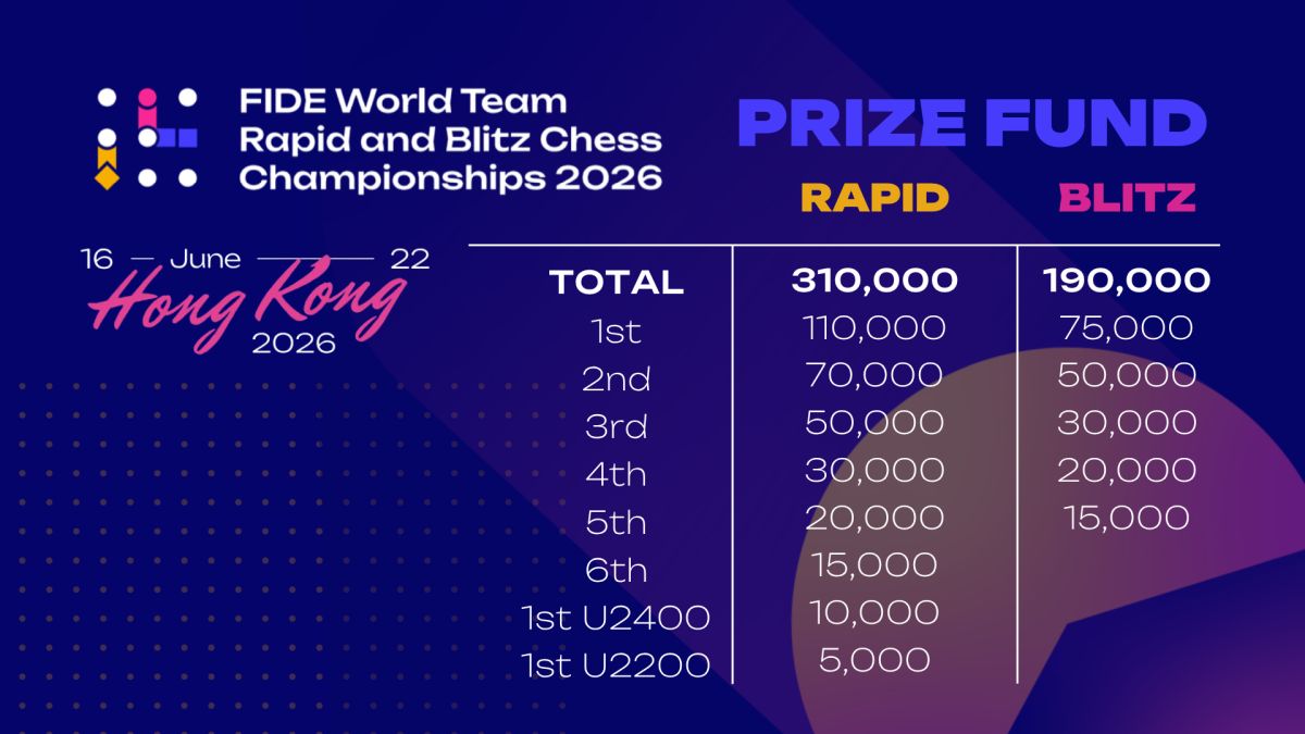 The total prize fund across both championships is €500,000. The Rapid Champion team will receive €110,000, with the Blitz champion team taking home €75,000.