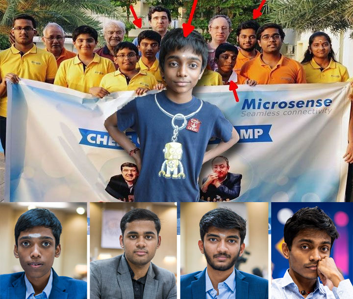 The top Indian players: Praggnanandhaa, Erigaisi, Gukesh and Aravindh (photos FIDE) as young super-talents, and as top players today. Aravindh was in the top ten briefly.