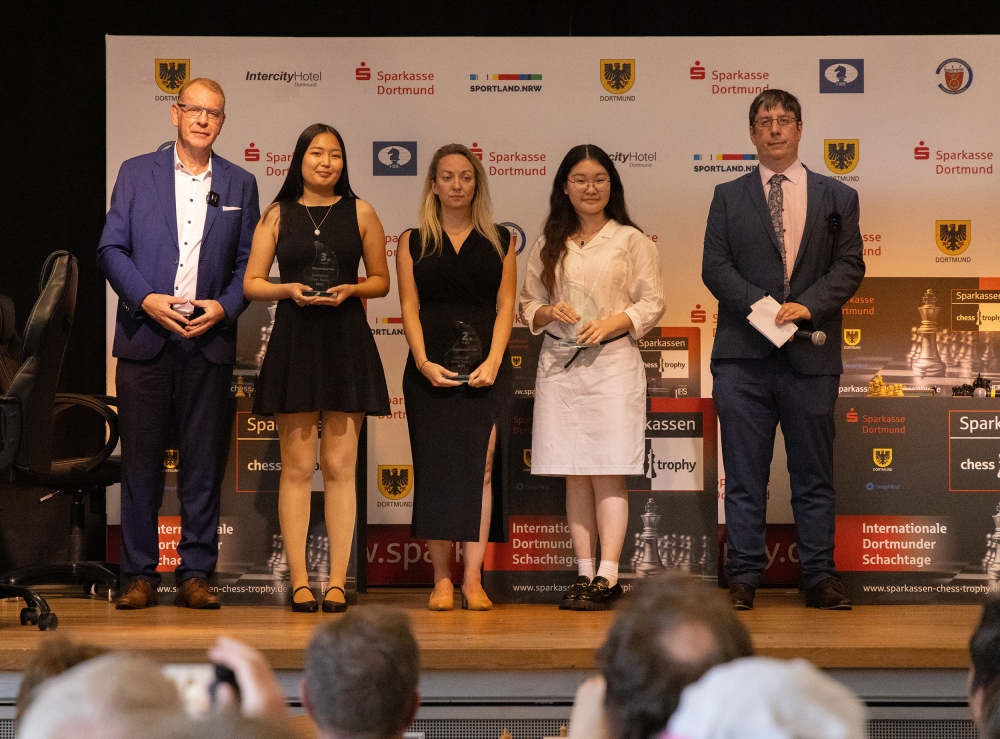 In the final round of the Sparkassen Chess Trophy International Women's Tournament, places 2 to 4 were still up for grabs. The winner, Miaoyi Lu from China, had already been decided after her brilliant tournament. Lu had white against Dinara Wagner in the final round. The German national player followed up her announcement that she would now play every game to win with action and started the game sharply in the Sicilian. Lu once again played aggressively on the kingside with early g2-g4-g5, a trademark of her white games. But today, the tactically strong 15-year-old made a mistake in the middle game. Wagner seized the opportunity, first pinning the white king in the centre and later converting to an easily won rook endgame.
