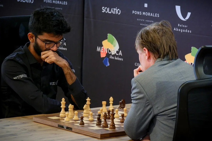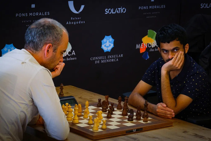 Nihal Sarin lost with black to Leinier Domínguez. Otherwise, however, the Indian grandmaster has excelled in Menorca - after seven rounds, he is tied for first place with Ruslan Ponomariov. | Photo: Saji Mathew