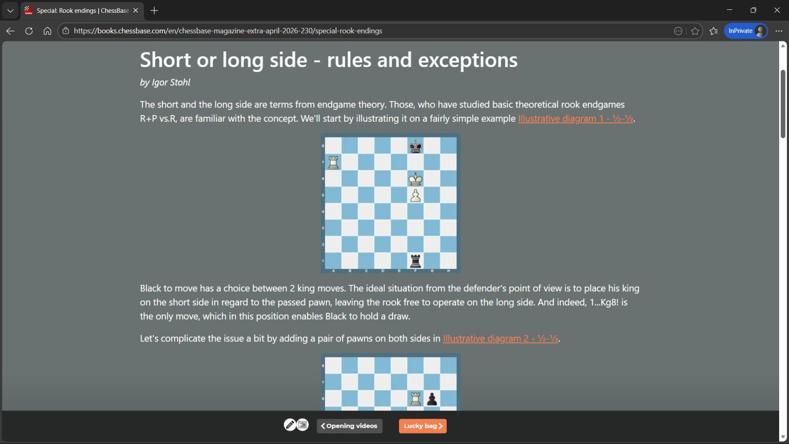 Where does the defending king belong in rook endgames? Igor Stohl explains the basic rules using a simple example with rook and pawn vs. rook, and then moves on to trickier cases with rook + two pawns vs. rook + two pawns.